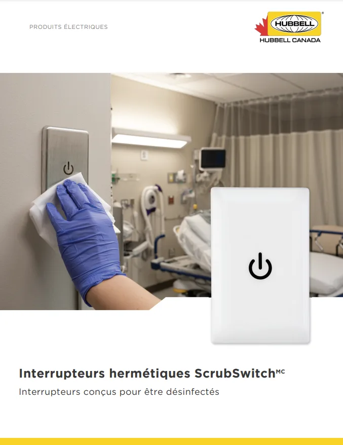 Nos dispositifs ScrubSwitchTM sont les premiers interrupteurs hermétiques conçus pour résister aux rigueurs des solutions de nettoyage médicales et aux protocoles plus stricts. Contrairement aux interrupteurs à bascule, la surface totalement lisse de la plaque n'offre aucun endroit où les bactéries puissent se cacher. Les interrupteurs ScrubSwitch sont parfaits pour une utilisation dans les cabinets de médecins et de dentistes, les centres de réhabilitation, les écoles et dans les nouvelles constructions ou les lieux de rénovation.
