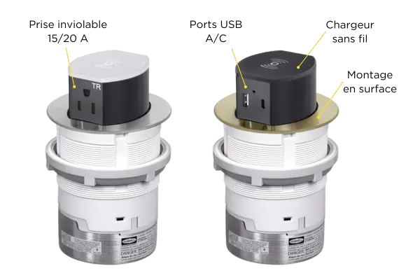 La prise de comptoir offre sept finitions de bride distinctes pour s'intégrer de manière transparente à tout design de comptoir de cuisine ou de vanité de salle de bain. Ces finitions offrent une esthétique unique qui peut compléter une large gamme de comptoir, du granit au marbre, et même le bois. De plus, la prise dispose de trois plateaux interchangeables. Ces combinaisons polyvalentes rendent la prise de comptoir hautement personnalisable et pratique pour tout espace.