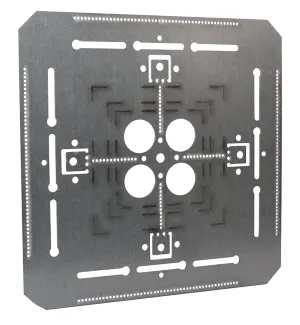 Two different 12”x12” plates hold boxes from 4” square to 6”x6”. Model 9112R is flat, while the 9112RL model includes a lanced edge for easier mounting of one-hole straps. The 9118R 18”x18” plate can hold multiple 4” square boxes or single larger boxes up to 12”x12”.