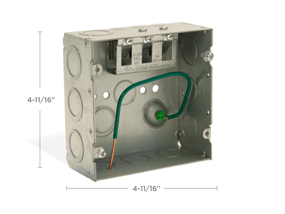 Available in 4” and 4-11/16” box sizes. Along with our MC cable connector, built-in cable management clip options provide first means of support. Brackets and far side supports for stud mounting also available.